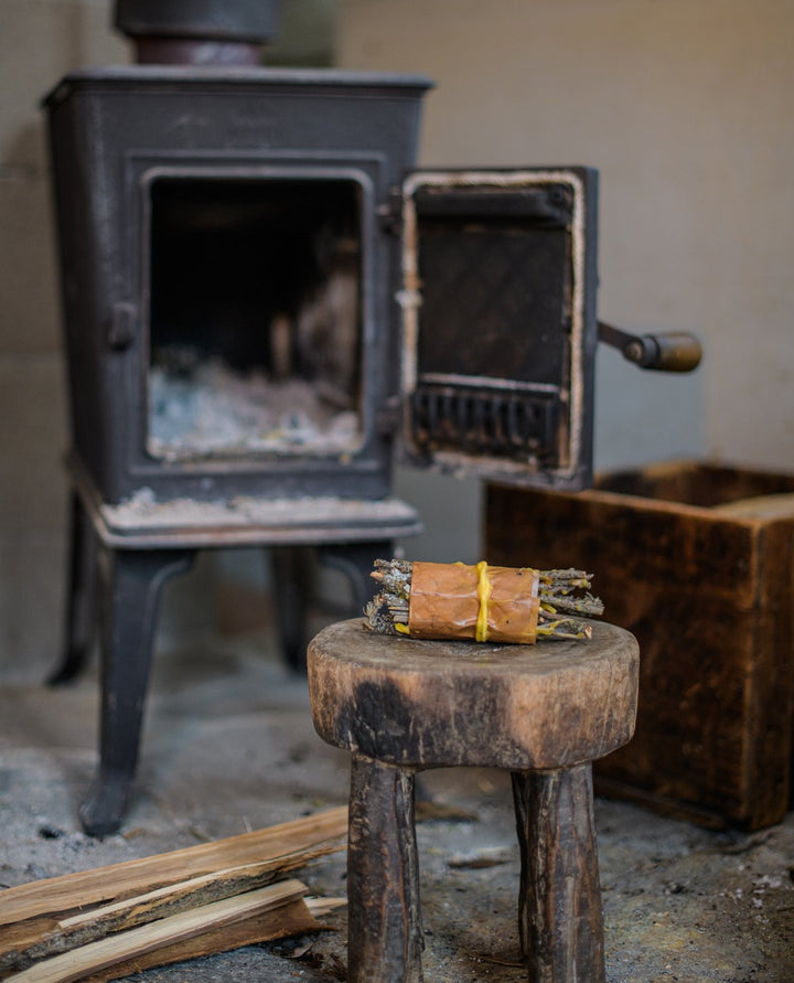 These fire starters are made from the bits of waste that result from making beeswax candles. Within the bundles are bits of beeswax, paper, and cotton, as well as collected twigs and intentionally selected plants. Paper is wrapped around each bundle and then it is sealed with beeswax. The twigs that are used are fallen branches from the overgrown apple orchard on the land where Golden Hill Candle studio is located. The paper that is used to wrap the bundles is kraft paper received in packages. Each bundle contains one type of plant that was grown at the candle studio or foraged for in the wilds of Vermont.