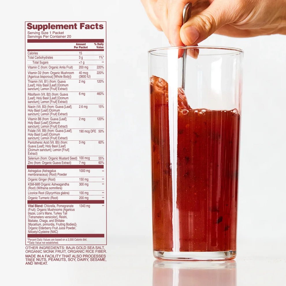 • *Ginger, *Turmeric, Vitamin D2, Astragalus, *KSM-66® Ashwagandha, NAC (N-Acetyl Cysteine), *Immune Mushroom Blend (Agaricus Blazei, Lion’s Mane, Turkey Tail, Reishi, Maitake, Chaga, Shiitake), *Amla (50% Vitamin C), *Elderberry Juice, Licorice Root, Guava Leaf Extract, Holy Basil, Lemon Extract, *Monk Fruit Powder, Baja Gold Salt, *Mustard Seed, Chlorella, Pomegranate, *Rice Fiber *Organic Ingredient.