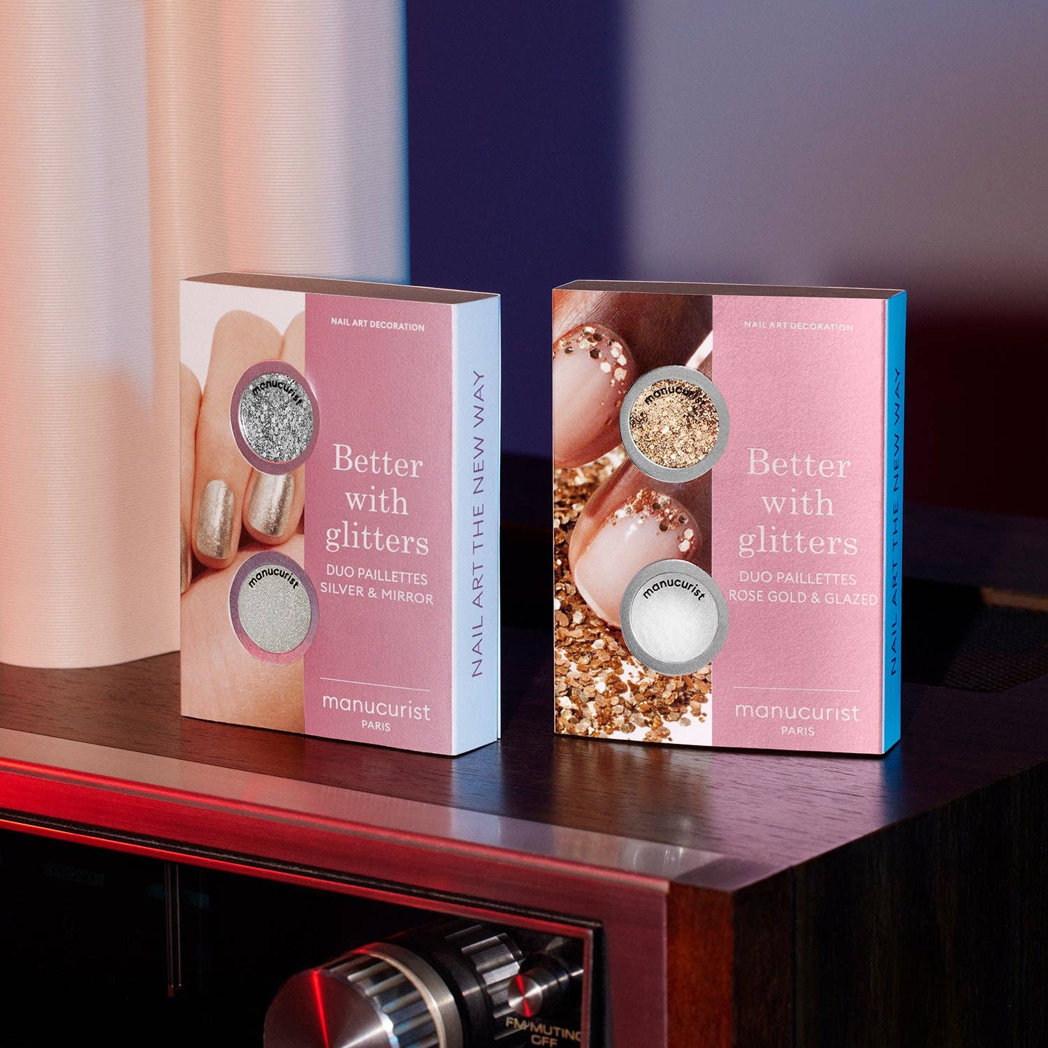 With Manucurist's duo, make your nails shine! Transform your nail game with this dynamic duo of Rose Gold glitter and Glazed effect powder. Crafted from regenerated plant cellulose, the shimmering Rose Gold brings instant glamour to any manicure, while the Glazed powder delivers a mesmerising pearlescent finish that catches the light beautifully. Mix, match, or layer for endless sparkle possibilities.