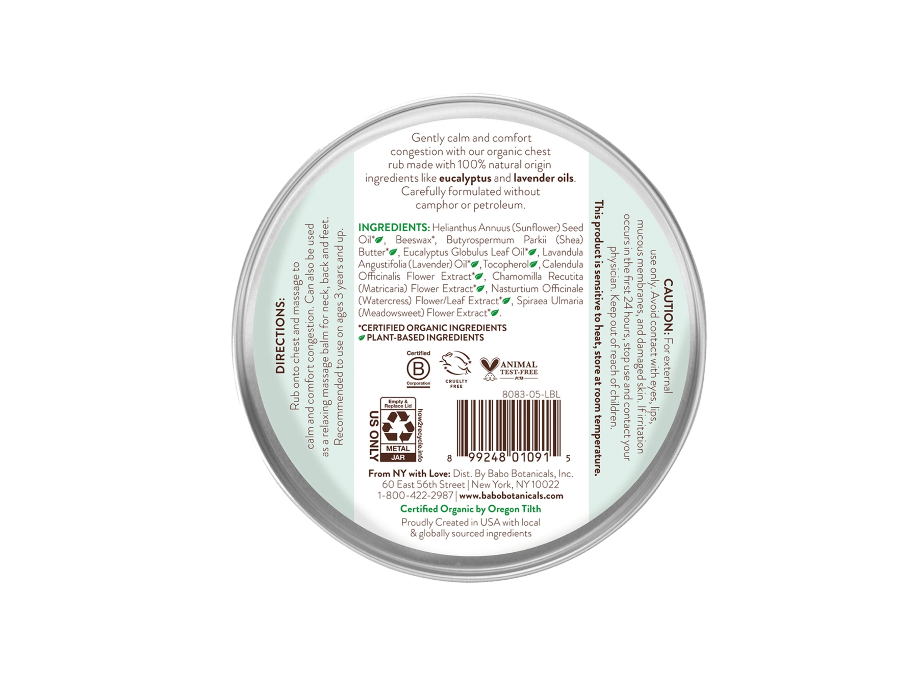 Breathe easy with Babo Botanical's USDA® Certified Organic chest rub packed with eucalyptus vapors to ease congestion and soothe coughs naturally. Blended with lavender, rosemary oil, and shea butter, this 100% natural formula delivers gentle comfort without camphor or petroleum. Beyond the chest, use it as a relaxing massage balm for your neck, back, and feet whenever you need a moment of calm. Safe for ages 3 and up, it's your go-to remedy for respiratory relief and everyday wellness.