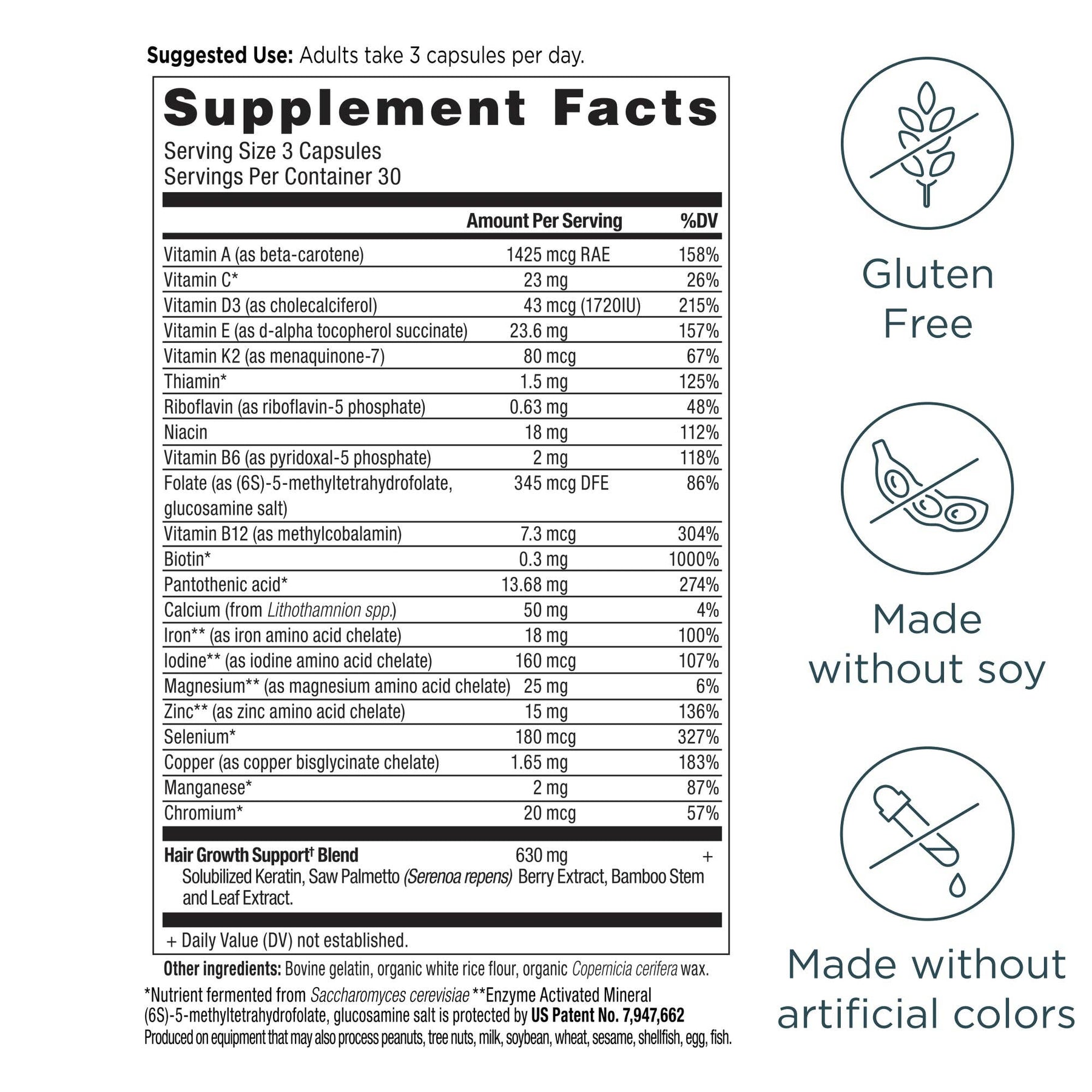 Support your hair’s natural growth with Ancient Nutrition's peptide-enhanced multivitamin. Experience thicker, shinier hair in just 90 days†, with hair appearing 35% brighter after 60 days and 47% brighter after 90 days†. It provides 22 essential vitamins and minerals, including methylated B12 and folate, along with amino acid chelated minerals to promote better digestion and absorption. This formula is designed to help you nourish your body and hair with care and confidence.