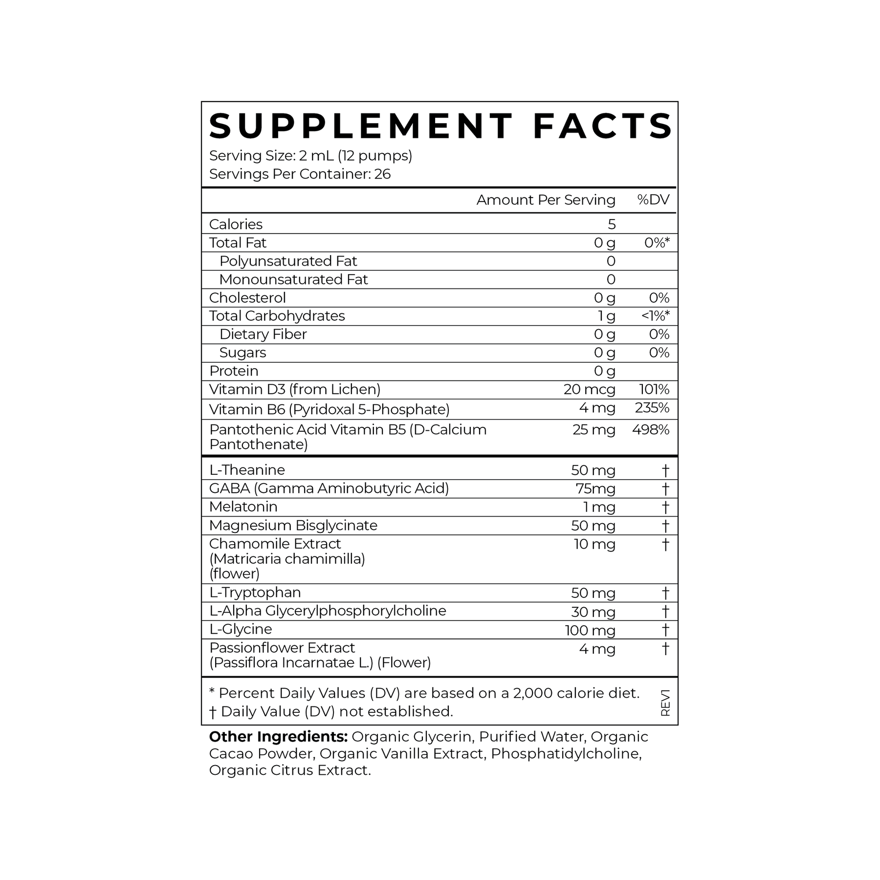 • Vitamin D3 (from Lichen), Vitamin B6 (Pyridoxal 5-Phosphate), Pantothenic Acid Vitamin B5 (D-Calcium Pantothenate), L-Theanine, GABA (Gamma Aminobutyric Acid), Melatonin, Magnesium Bisglycinate, Chamomile Extract (Matricaria chamomilla) (flower), L-Tryptophan, L-Alpha Glycerylphosphorylcholine, L-Glycine, Passionflower Extract (Passiflora Incarnata L.) (Flower).