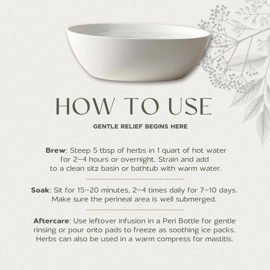 Preparation: For a strong infusion, steep 5 tablespoons of herbal mixture in 1 quart of water for 2-4 hours or overnight. Strain and add to the bathtub or sitz bath basin. Add 1-2 quarts of warm water if desired. After steeping, strain the herbs and save them if you wish to reuse them for a second infusion. Alternatively, for immediate use, place the herbs in a cotton tea net or muslin bag and hang over the faucet or place directly in the tub as it fills with warm water. Soak: Whether using a sitz bath basin or a full bathtub, soak for 15-20 minutes. Ensure that the perineal area is well submerged to help increase blood flow to the area, which can reduce pain and swelling. Repeat up to 2-4 times daily for 7 to 10 days for optimal postpartum recovery. Clean your tub before using it each and every time! It may seem like an unnecessary step, but it’s essential to prevent infection. Your wounds are still healing. Peri Bottle: Use some of the leftover or additional brewed herbal infusion to fill a Peri Bottle. This can be used for a gentle rinse after using the bathroom, providing soothing relief and maintaining cleanliness without irritation. Post-Bath Care: Use leftover brewed infusion in a Peri Bottle for a gentle post-toilet rinse. Pour pre-brewed mix onto sanitary pads and freeze for soothing ice packs. Dilute and use for gentle newborn cord stump care. Additional options: Add 1 to 2 cups Epsom salt and 1/2 to 3/4 cup baking soda per gallon of water if desired. Rinse off the salts in fresh water. Note: Always clean the tub (or ask someone to do it for you) thoroughly before use to prevent infection and maintain hygiene. Taking time for sitz baths can significantly enhance your healing and mood during the postpartum period.