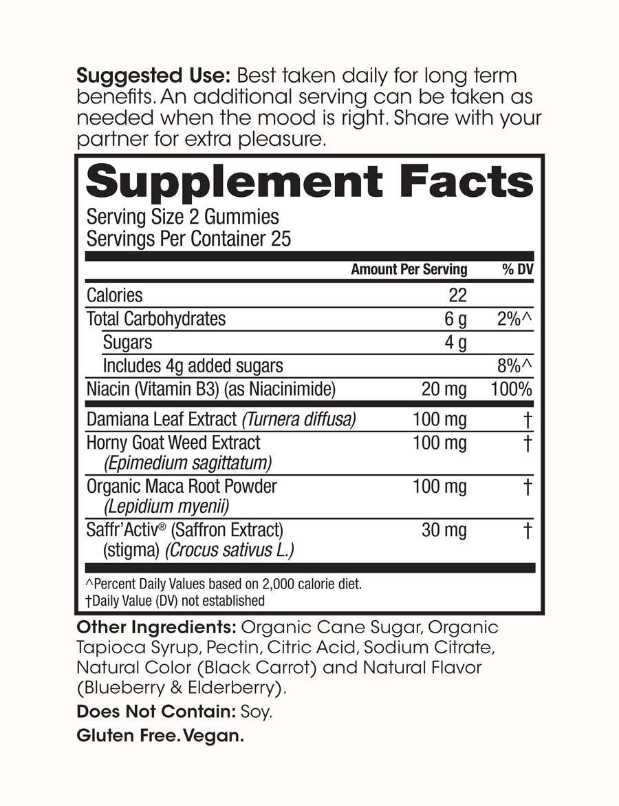• Damiana Leaf Extract (Turnera diffusa), Horny Goat Weed Extract (Epimedium sagittatum), Organic Maca Root Powder (Lepidium myenii), Saffr'Activ® (Saffron Extract).
