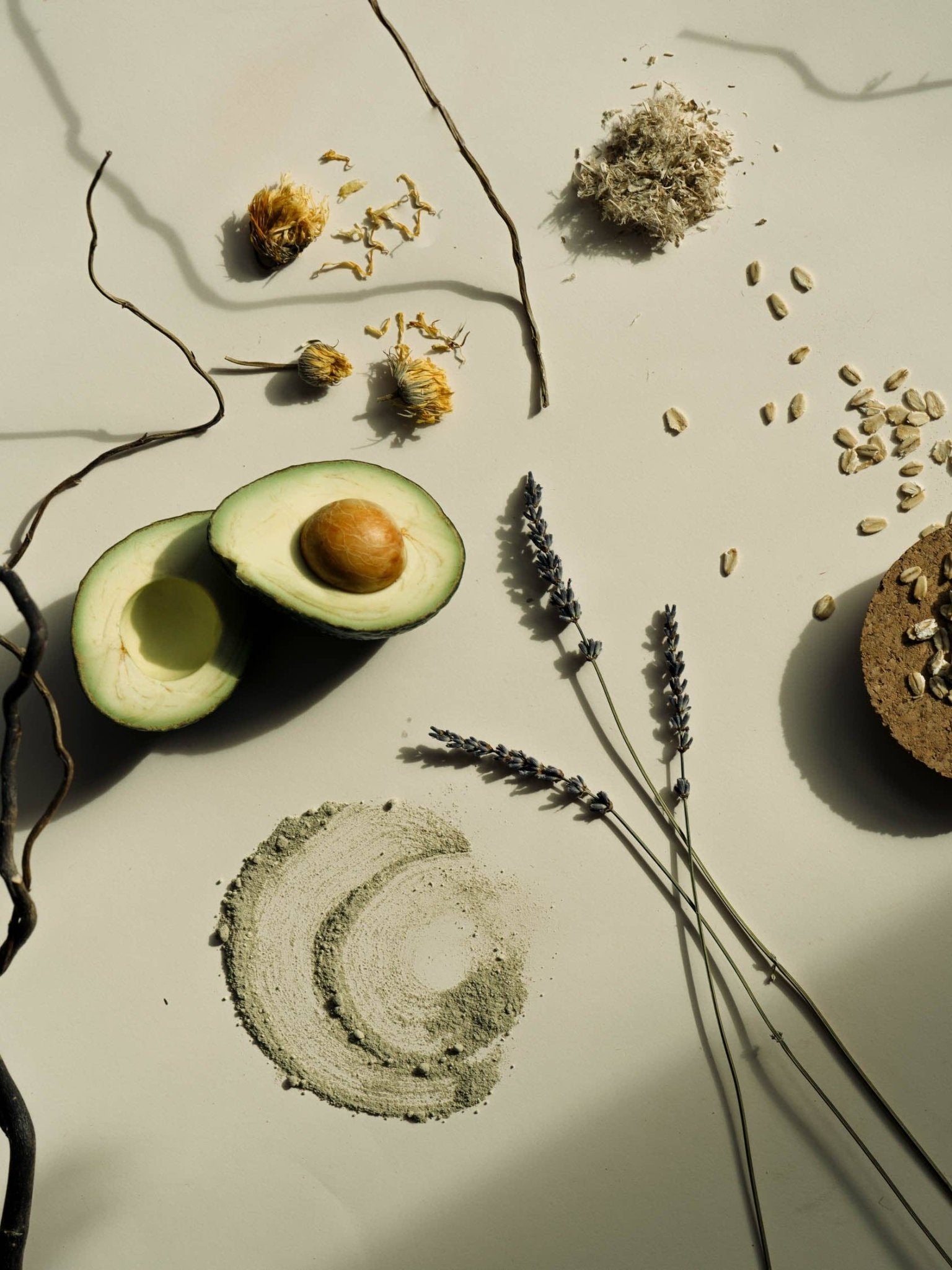 • Avocado (Persea gratissima)*, Oat (Avena Sativa)*, Dead Sea Clay **, Kaolin **, Alfalfa (Medicago sativa) *, Burdock (Arctium lappa)*, Marshmallow (Althaea officinalis)*, Matcha (Camellia sinensis)*, Lavander (Lavandula x intermedia)*, Calendula (Calendula officinalis)*, Hyaluronic Acid (Sodium hyaluronate)**.